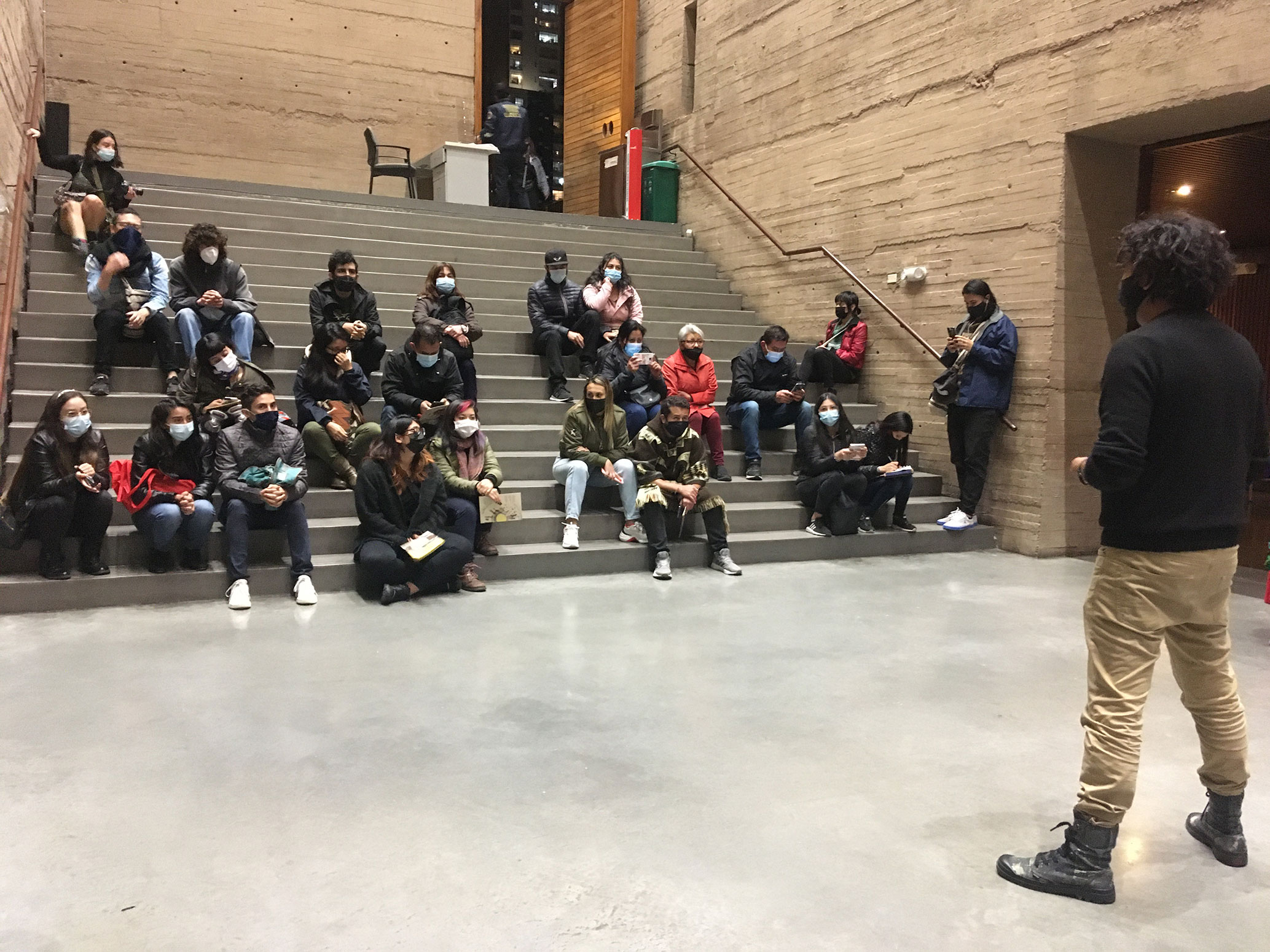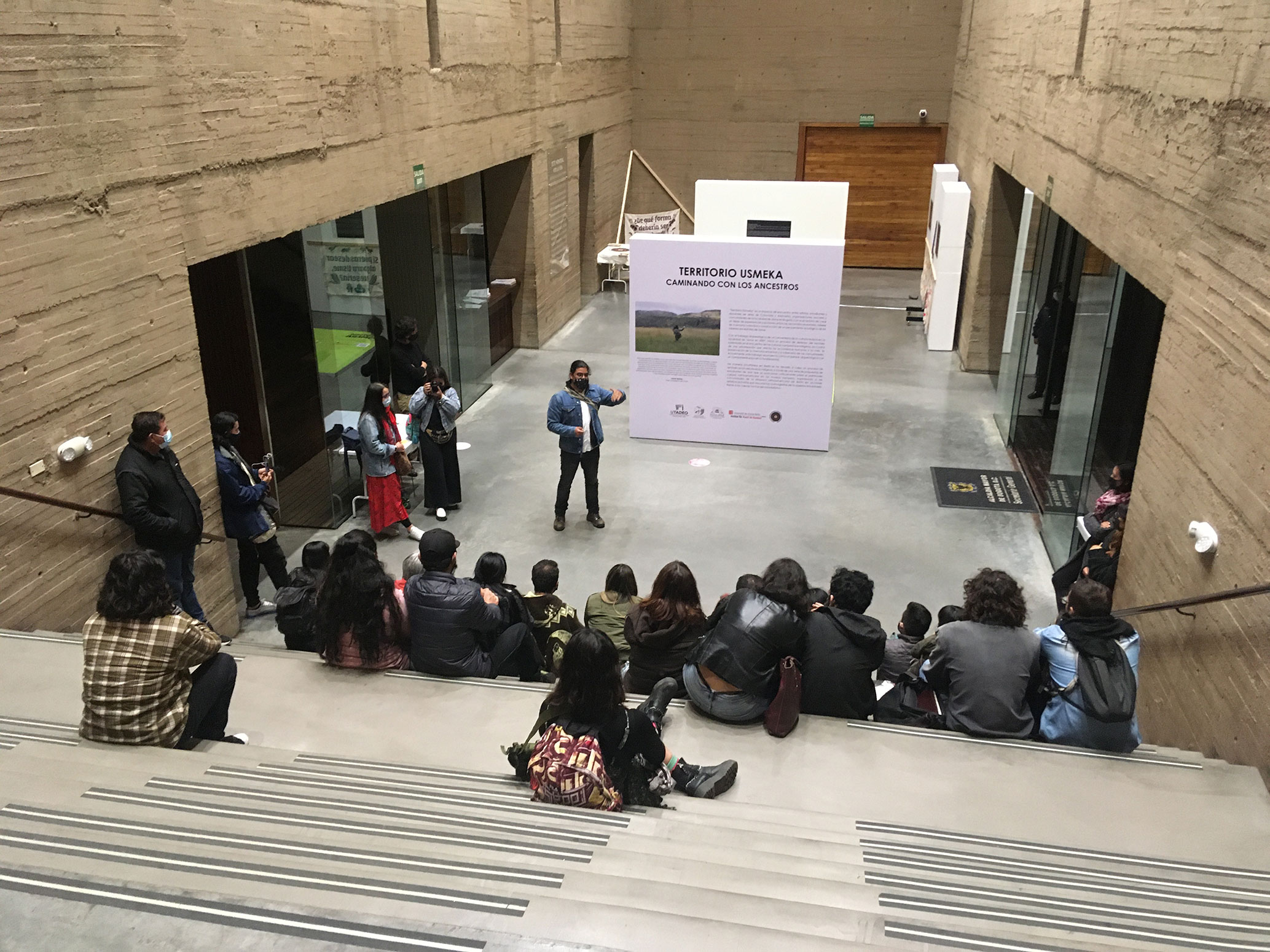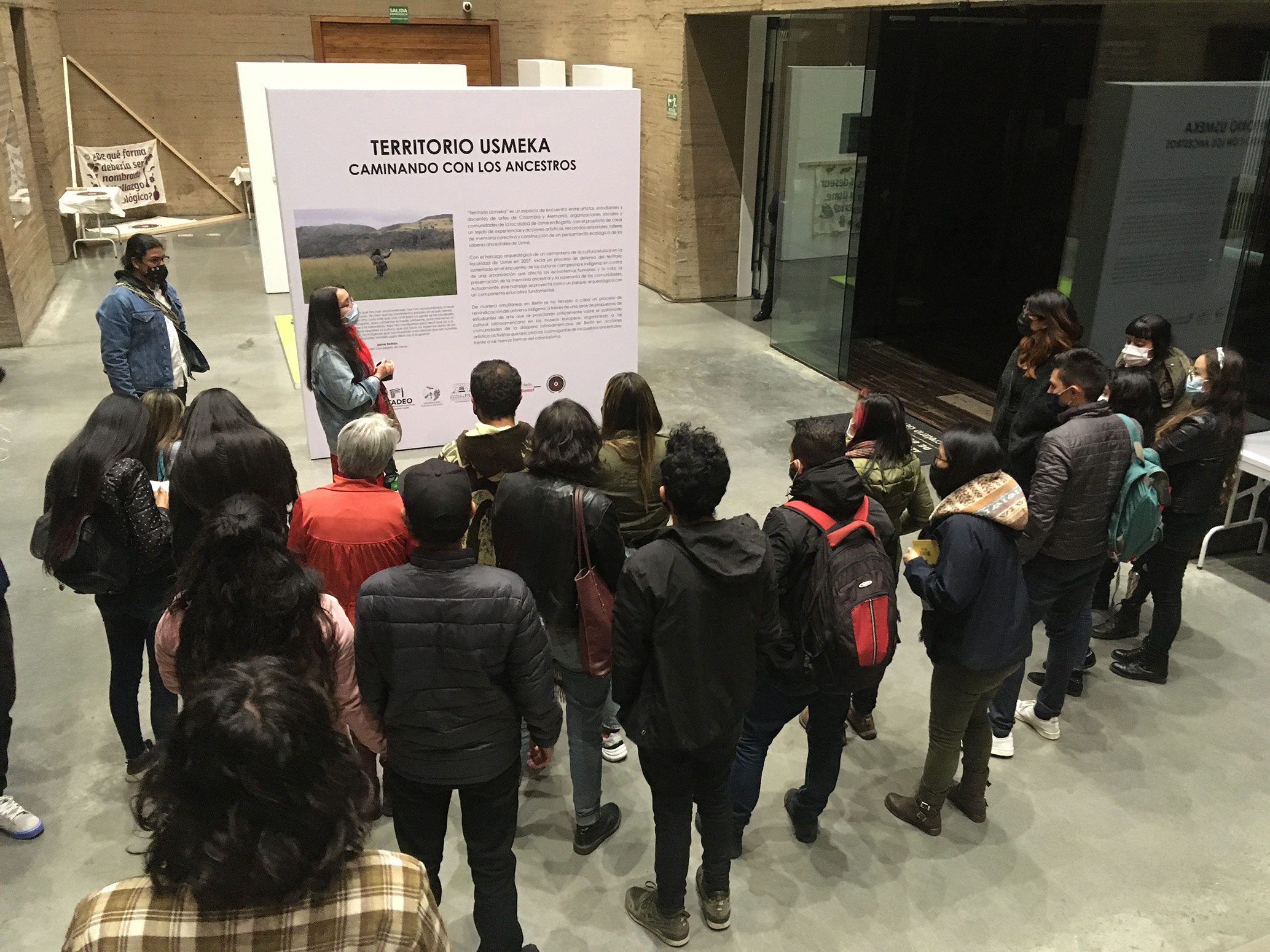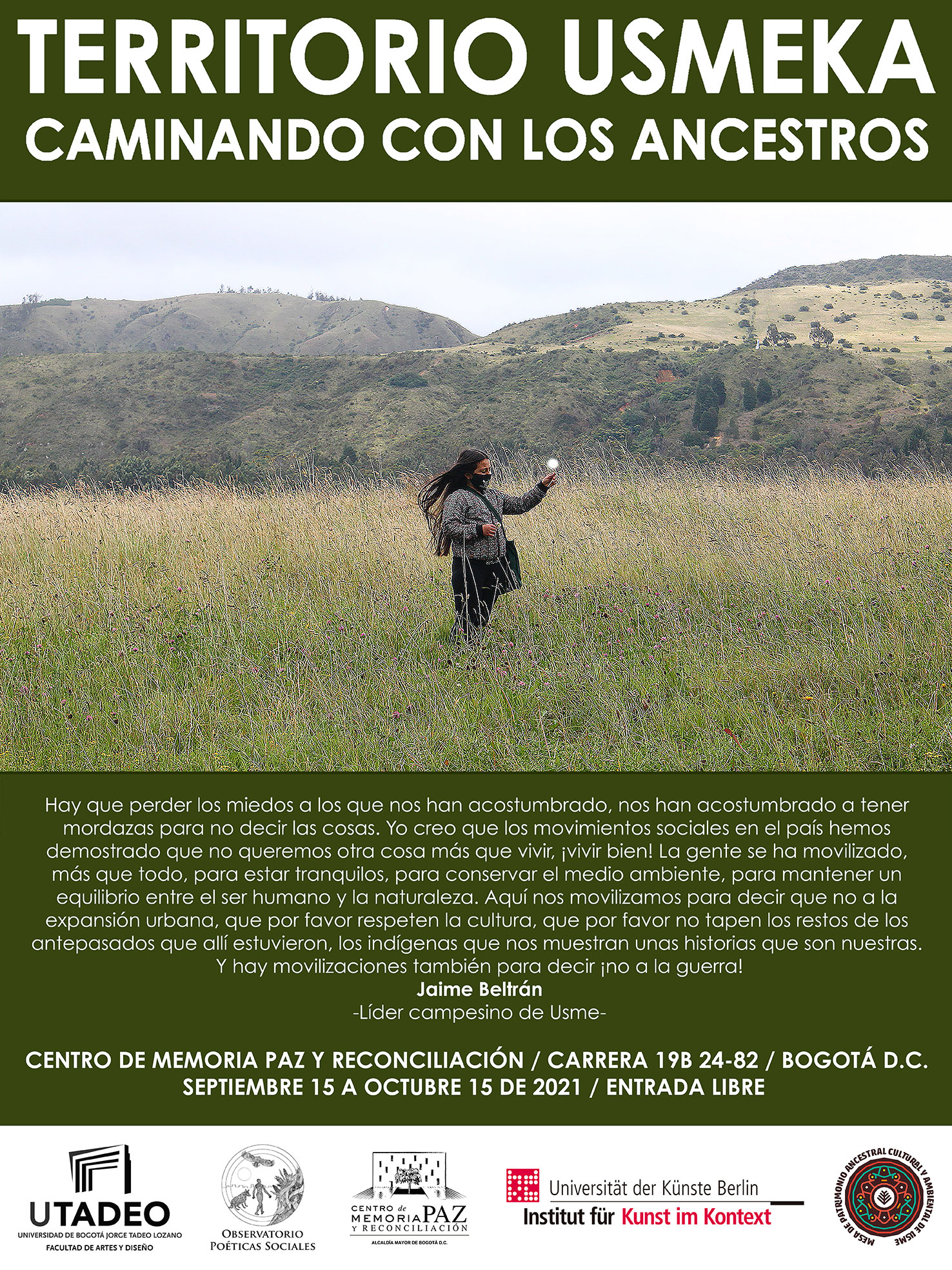 El punto de partida de “Territorio Usmeka: Caminando con los Ancestros” son las posturas críticas de cinco artistas latinoamericanos que participan en el Humboldt Fórum de Berlín a partir de una problemática sobre colonialismo y museo. Desde 2018, el grupo de trabajo Decolonize M21 se ha centrado principalmente en el patrimonio cultural latinoamericano en los museos europeos y berlineses. A través de un trabajo fílmico y performativo, así como de intervenciones en Berlín (Alemania) y Lima (Perú), hacen preguntas importantes sobre la colonización de Abya yala, incluyendo a comunidades diaspóricas latinoamericanas e indígenas de Berlín en acciones artístico-activistas. En enero de 2021, un nuevo grupo de artistas, predominantemente latinoamericano, se conformó en el Instituto de Arte en Contexto de Berlín para preparar esta exposición en el Centro de Memoria, Paz y Reconciliación, reuniéndose en línea con artistas de Bogotá durante cinco meses alrededor de una pregunta coyuntural: ¿Cómo traducir las posturas artísticas de Berlín al contexto de Bogotá? A esta serie de encuentros asistió la Mesa de Patrimonio Ancestral, Cultural y Ambiental de Usme, aportando su experiencia frente al hallazgo arqueológico de un gran cementerio indígena Muisca que revela el pasado ancestral de la cultura campesina de Usme y aporta nuevos puntos de vista sobre el territorio, el cuidado del medio ambiente y el respeto a los distintos modos de vida. En Bogotá, la exposición en el Centro de memoria, Paz y Reconciliación se abrió con una charla y un recorrido por las distintas etapas del proceso: -Las propuestas artísticas de Berlín; -Los recorridos y talleres que se realizaron en Usme; -La elaboración de una serie de banderas que acogen símbolos ancestrales y enuncian varias preguntas sobre el hallazgo arqueológico, sobre el cuidado del medio ambiente y la cultura campesina de Usme; -La materialización de una cartografía sonora que recoge los relatos y las historias de los habitantes de la localidad. Esta exposición surge de un complejo proceso de pensamiento colectivo en el que se abordan temas relacionados con el territorio, la comunidad, el patrimonio culturall, la historia y el colonialismo; transitando entre el arte, la cultura, la academia y el contexto social.