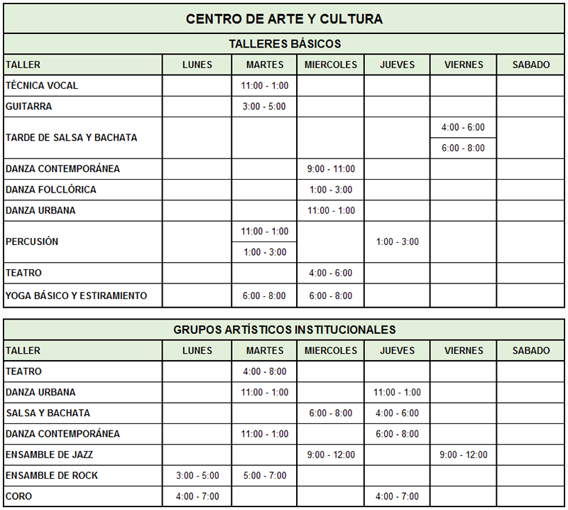 En febrero iniciarán los talleres en las diferentes áreas artísticas y de desarrollo humano donde encontrarás, danzas, teatro, yoga, coro, guitarra, ensamble de rock entre otros, que estarán abiertos durante el primer periodo académico, ofreciendo una excelente opción para el aprovechamiento de tiempo libre entre clases, con el fin de descubrir talentos que potencializara tus habilidades.