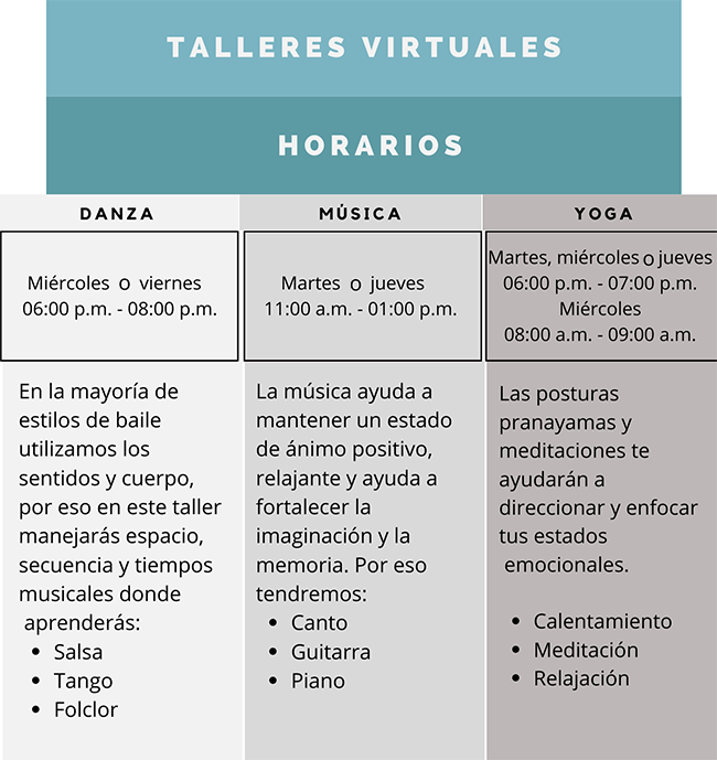 Para este semestre los talleres van a estar en tres grandes líneas: danza, música y yoga y se dividirán mensualmente en diferentes géneros de la siguiente manera: