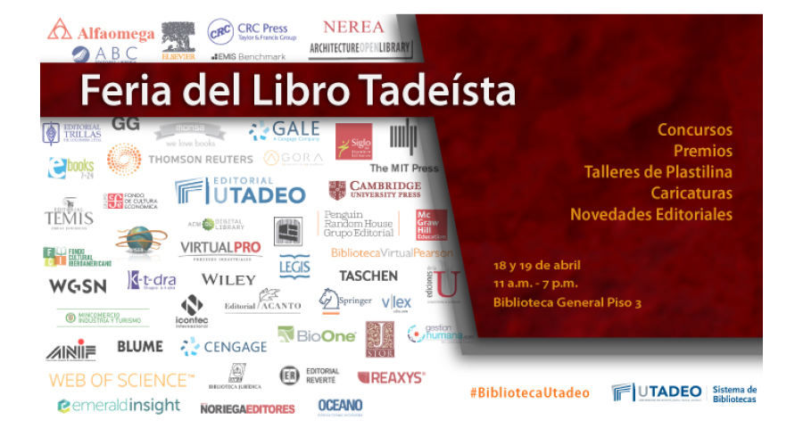 La Biblioteca Utadeo invita a la feria del libro Tadeísta, un espacio de encuentro en el que es posible conocer los recursos de información disponibles para la investigación, apreciar las novedades editoriales de los diferentes fondos y seleccionar material bibliográfico como apoyo al proceso académico; además de participar en talleres de plastilina y caricatura (materiales incluidos).