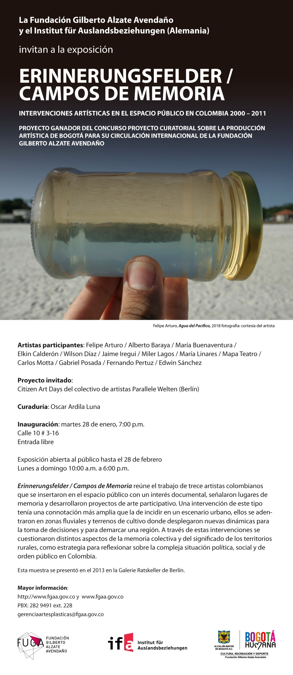 En particular, la exhibición de Campos de memoria en Bogotá tendrá como invitado al Proyecto “Citizen Art Days” del colectivo Paralelle Welten de Berlín con el fin de contribuir a la construcción de redes que potencien las prácticas artísticas contemporáneas para así poner en diálogo diversas memorias urbanas y acercar al público a procesos artísticos sobre realidades locales que en último término reflexionan sobre aspectos sociopolíticos del mundo global.
