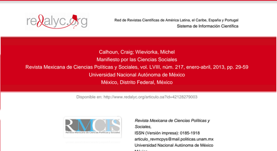 Este Manifiesto fue originalmente publicado en francés: Calhoun, Craig y Michel Wieviorka, (2013) “Manifeste pour les sciences sociales” en Socio, Penser Global. Núm. 1, marzo, pp. 3-38, y cedido para su publicación en español a la Revista Mexicana de Ciencias Políticas y Sociales, y divulgado por la Red de Revistas Científicas de América Latina, el Caribe, España y Portugal REDALYC.