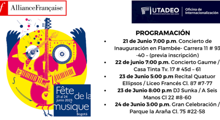 La Alianza Francesa de Bogotá abre sus puertas a lo mejor de la música y se une a la “Fête De La Musique” o “La Fiesta de la música”, una celebración internacional que deleita a múltiples audiencias de todo el mundo desde su origen en Francia en 1981. La edición 2023, tendrá lugar en Bogotá del miércoles 21 al  sábado 24 de junio y  contará con la participación de talentosos artistas franceses y locales, brindando una muestra de la diversidad musical que caracteriza a este evento.