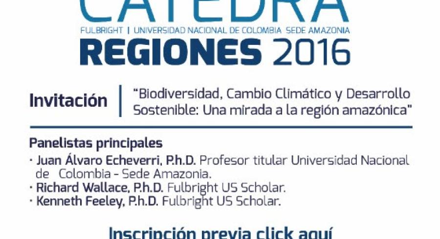 El próximo 18 de noviembre se llevará a cabo la Cátedra Fulbright Regiones 'Biodiversidad, Cambio Climático y Desarrollo Sostenible: Una mirada a la región Amazónica' en la ciudad de Leticia. El evento, organizado con el apoyo de la Universidad Nacional Sede Amazonía, tendrá lugar en el Auditorio Victoria Amazónica de 8:00a.m. a 6:30p.m. y contará con la participación de panelistas expertos como Juan Álvaro Echeverri, Profesor titular de la Universidad Nacional; Richard Wallace, becario Fulbright U.S. Scholar y Profesor Asistente de California State University; Kenneth Feely, becario Fulbright U.S. Scholar y Profesor Asistente de University of Florida.