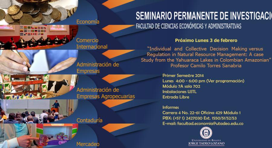 La Facultad de Ciencias Económicas Administrativas se complace en dar inicio a los Seminarios Permanentes de Investigación de la Facultad (2014). Este será un espacio para conocer lo que los grupos de trabajo están haciendo en materia de investigación con el fin de dar a conocer nuestros productos a pares amigos, estudiantes e invitados y generar sinergias entre la comunidad académica de la Facultad. La primera charla se titula “Individual and Collective Decision Making versus Regulation in Natural Resource Management: A case Study from the Yahuaraca Lakes in Colombian Amazonian" y estará a cargo del profesor Camilo Torres Sanabria.