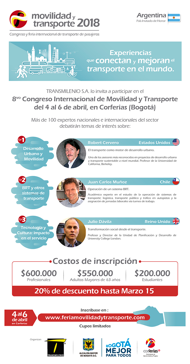 Del 4 al 6 de abril se celebrará la octava versión del Congreso Internacional de Movilidad y Transporte, un evento organizado por Corferias, Transmilenio S.A y la Alcaldía Mayor de Bogotá, que contará con representantes del sector de Estados Unidos, el Reino Unido y Chile, entre otros paises.