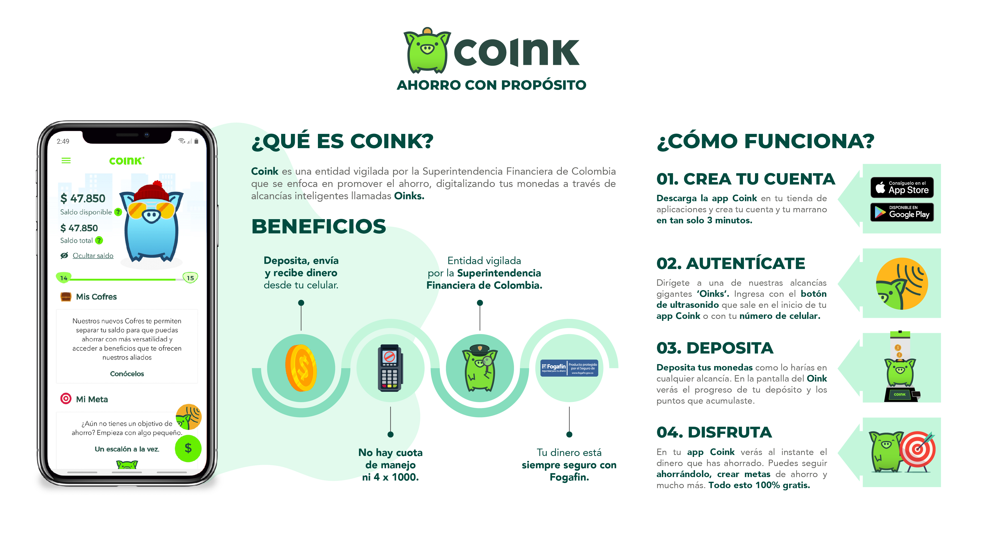 Un primer paso puede ser ahorrando esos pesos que quedan del mandado o de las vueltas del bus. Con tan sólo depositar las monedas que te quedan al final del día en un lugar seguro, ya estás ahorrando. Y de eso se trata Coink, un sistema de ahorro que permite que las personas conserven su dinero totalmente gratis y de una manera fácil, conveniente y divertida.