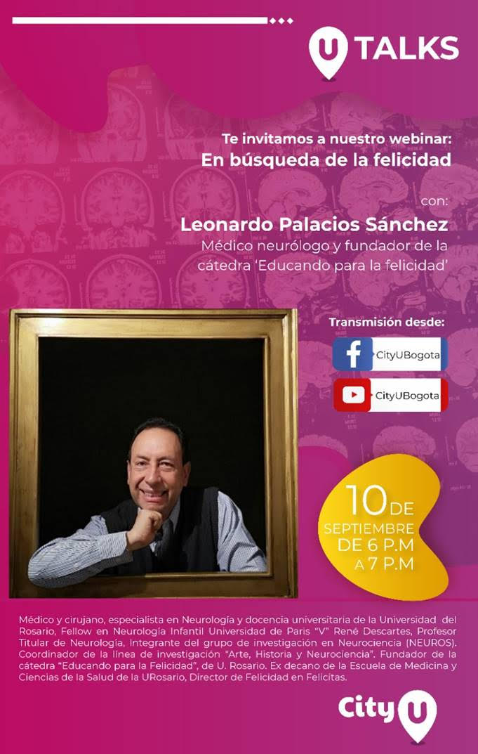 Como parte del ciclo de charlas de City U: “U Talks”, el próximo jueves 10 de septiembre, a partir de las 6:00 p.m., no te puedes perder el webinar: “En búsqueda de la felicidad”, con el médico neurólogo y fundador de la cátedra “Educando para la felicidad”, Leonardo Palacios Sánchez. La transmisión podrás verla a través de Facebook Live (@CityUBogota) o Youtube (CityUBogota) oficial de City U.