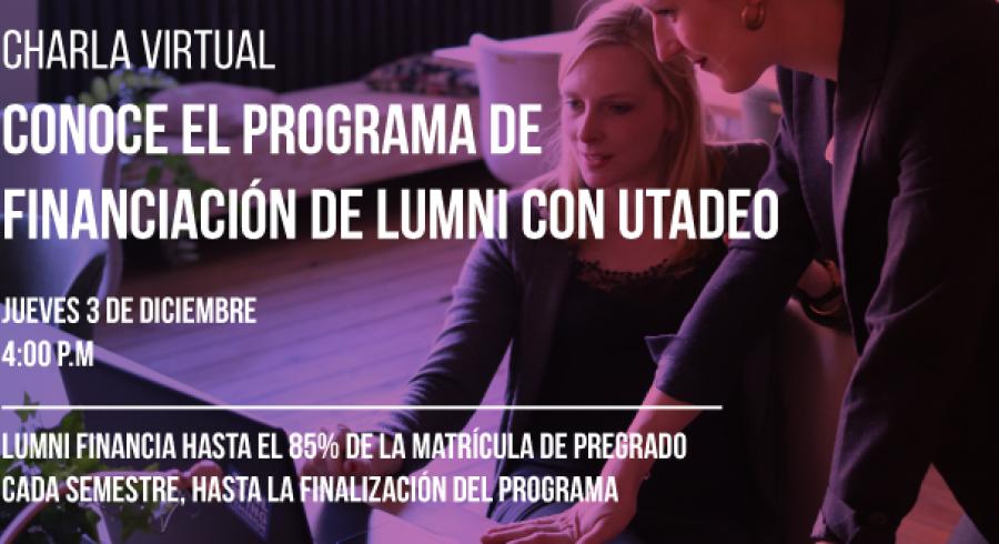 Conoce en este encuentro del día jueves 3 de diciembre a las 4:00 p.m., el programa de financiación a largo plazo gestionado por LUMNI, dirigido a estudiantes admitidos y estudiantes actuales de la Utadeo en algún programa de pregrado en Bogotá.