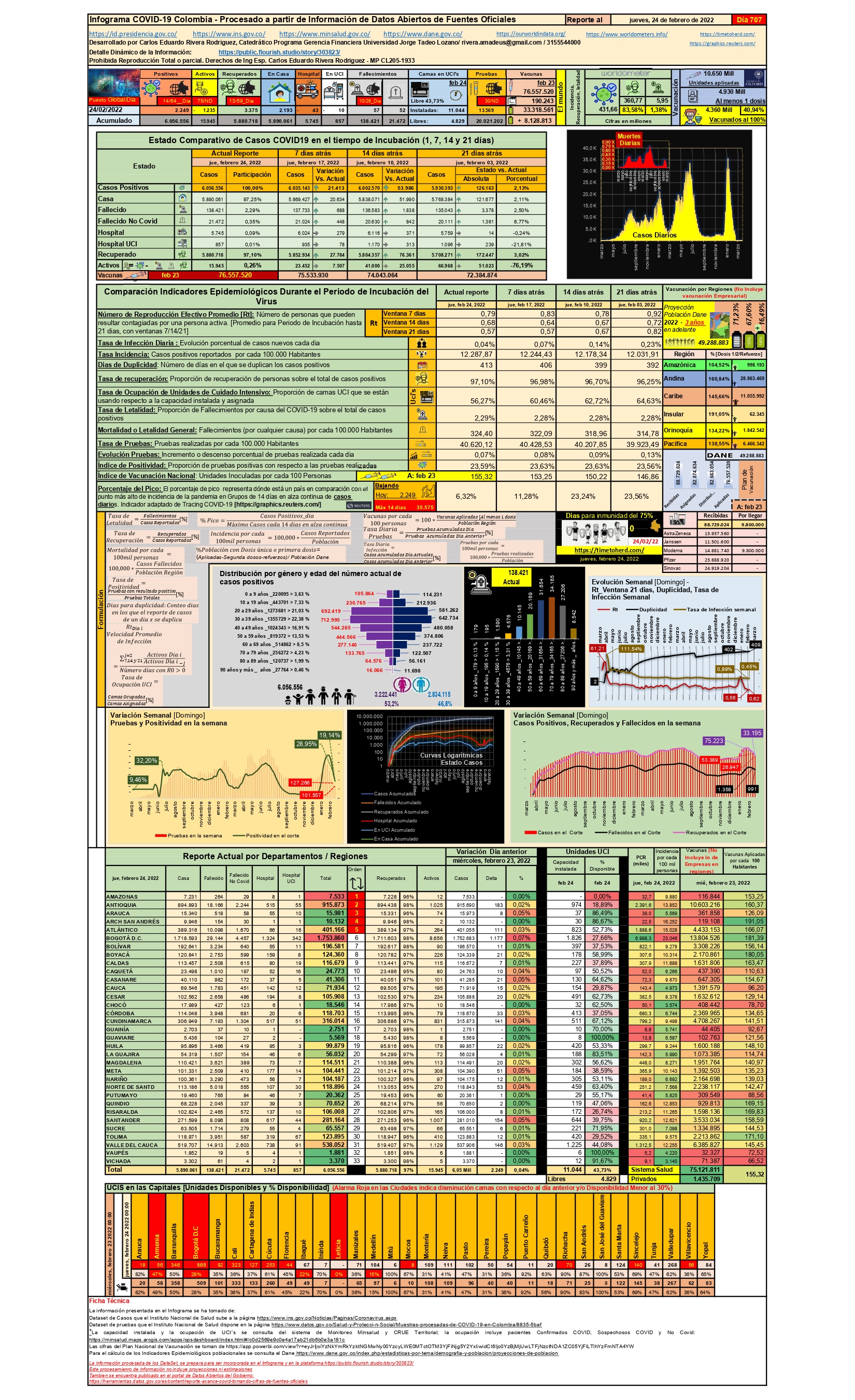 Cerremos el artículo de esa semana relacionando las cifras a corte del 24 de febrero en nuestro país: Se llegó a 6,05 millones de casos, se han recuperado 5,88 millones de personas y se han presentado 138.421 fallecimientos. El registro del día de corte fue de 2.249 casos y 57 muertes