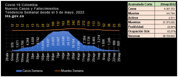 Mientras tanto, nuestro país continúa en una normalización de la situación, tal y como se puede determinar del reporte de cifras del Instituto Nacional de Salud del pasado 29 de septiembre; se encuentra que durante la semana anterior al corte se detectaron 820 casos (170 menos con respecto a una semana atrás), fallecieron 25 personas (2 más que las presentadas una semana atrás), continúan como activos 2.511 casos, las unidades de cuidado intensivo presentan una ocupación del 63,01%, y con respecto a la vacunación se llegó a 88’720.602 dosis, 36’670.153 personas han completado el esquema de dos dosis o monodosis, 14’115.363 personas se han aplicado un refuerzo y 1’813.094 ya cuentan con segundo refuerzo.