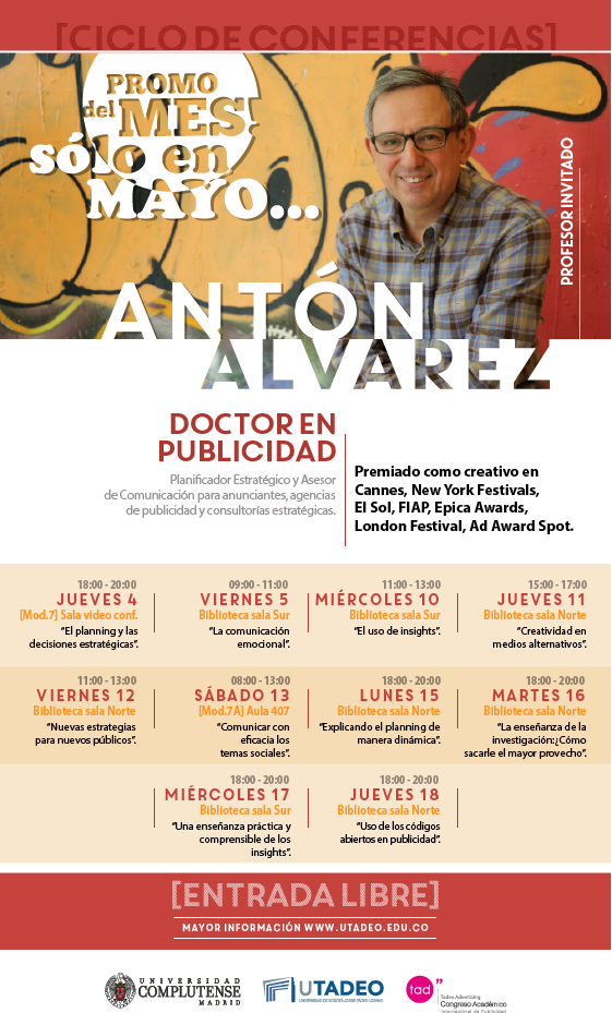 El Programa de Publicidad y la Escuela de Publicidad de la facultad de Artes y Diseño de la universidad Jorge Tadeo Lozano, se complace en invitar al ciclo de conferencias que estará a cargo del profesor invitado de la Universidad Complutense de Madrid el Doctor Antón Álvarez, Licenciado y Doctor en Publicidad, Planificador Estratégico y Asesor de Comunicación para anunciantes, agencias de publicidad y consultorías estratégicas. Premiado como creativo en Cannes, New York Festivals, El Sol, FIAP, Epica Awards, London Festival, Ad Award Spot.