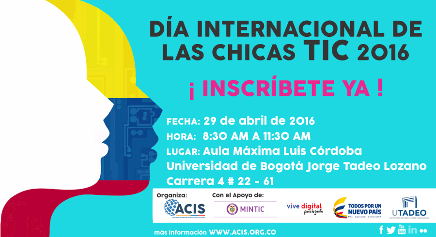 ACIS (Asociación Colombiana de Ingenieros de Sistemas) en alianza con el Ministerio TIC, celebrará el Día Internacional de las Chicas TIC el próximo viernes 29 de abril entre las 8:30 y las 11:30 a.m. en el Aula Máxima de la Universidad Jorge Tadeo Lozano de Bogotá.