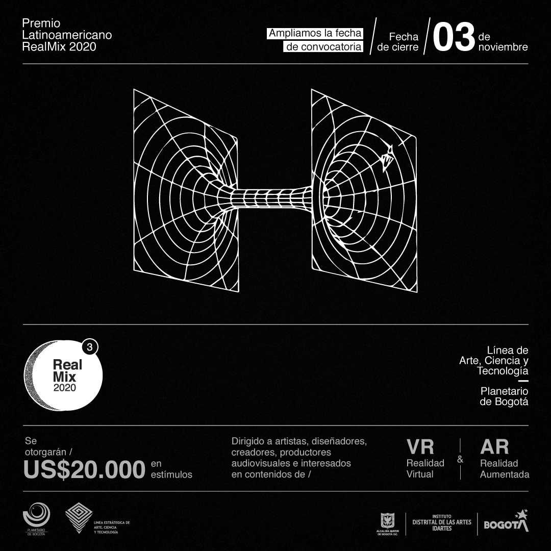 Con el objetivo de reconocer y fomentar la creación, el Instituto Distrital de las Artes – Idartes, a través de la Línea de Arte, Ciencia y Tecnología y el Planetario de Bogotá, abren la convocatoria al primer Premio Latinoamericano RealMix 2020, dirigido a latinoamericanos mayores de 18 años que sean artistas, diseñadores, artistas audiovisuales y programadores. Conozca las condiciones de participación en el siguiente enlace.