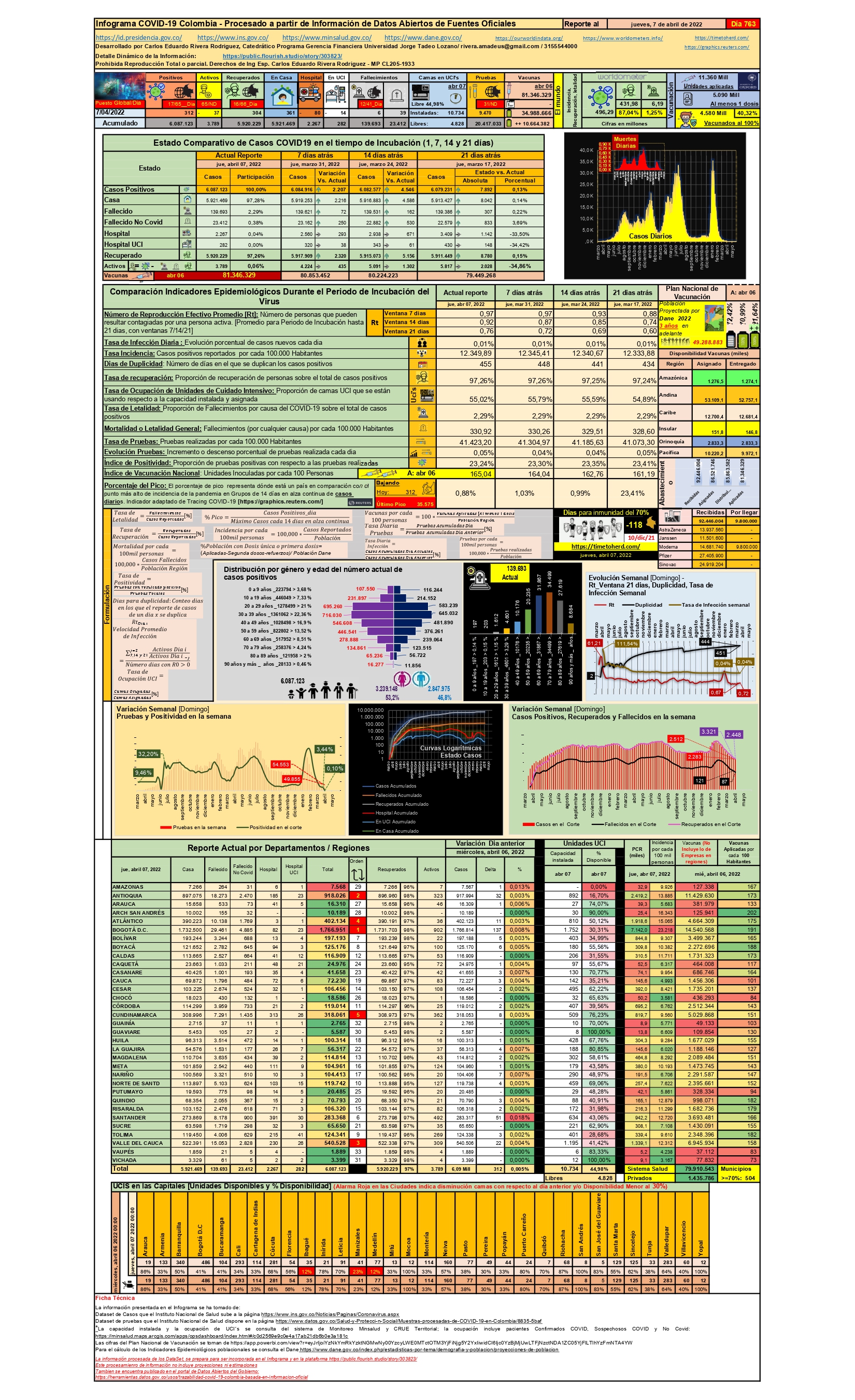 Termina el artículo, no sin dejar de vista las cifras globales y en el país sobre Incidencia-Recuperación y Letalidad a corte del 7 de abril: A nivel mundial [worldometers.info/] 496,29 millones de casos – 431,98 millones de personas recuperadas y 6,19 millones de muertes, mientras que en nuestro país [ins.gov.co/] se llegó a 6,09 millones de casos – 5,92 millones de personas recuperadas y 139.690 fallecimientos.