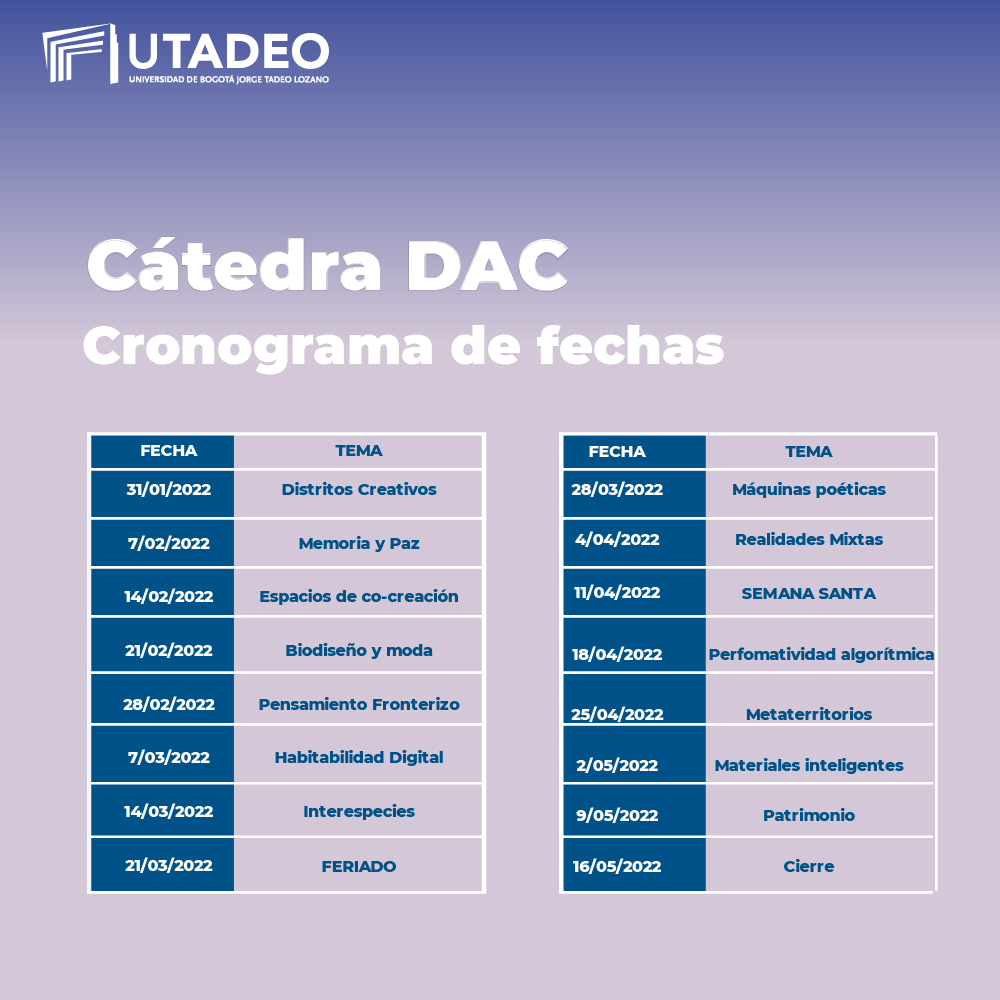 Fiel a su interés en generar espacios de reflexión alrededor de las relaciones entre Diseño, Arte y Ciencia para el abordaje de problemas contemporáneos, la Cátedra DAC, en su tercera edición busca profundizar en dichas conexiones así como indagar por nuevos vínculos dentro de los que se destacan la relación entre memoria y paz, los materiales inteligentes, el pensamiento fronterizo, la habitabilidad digital o la biocreación, por mencionar algunos.