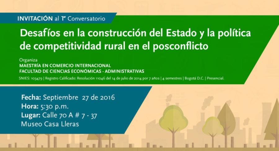 El Departamento de Economía, Comercio Internacional y Política Social de Utadeo, tiene el gusto de invitarlo al Primer Conversatorio "Desafíos en la construcción del Estado y la política de competitividad en el posconflicto",a partir de las 5:30 p.m., en el Museo Casa Lleras. El evento contará con la intervención de Salomón Kalmanovitz, Carlos Brando y Jaime Torres, con la moderación de Danilo Torres y la apertura de Oscar Granados.