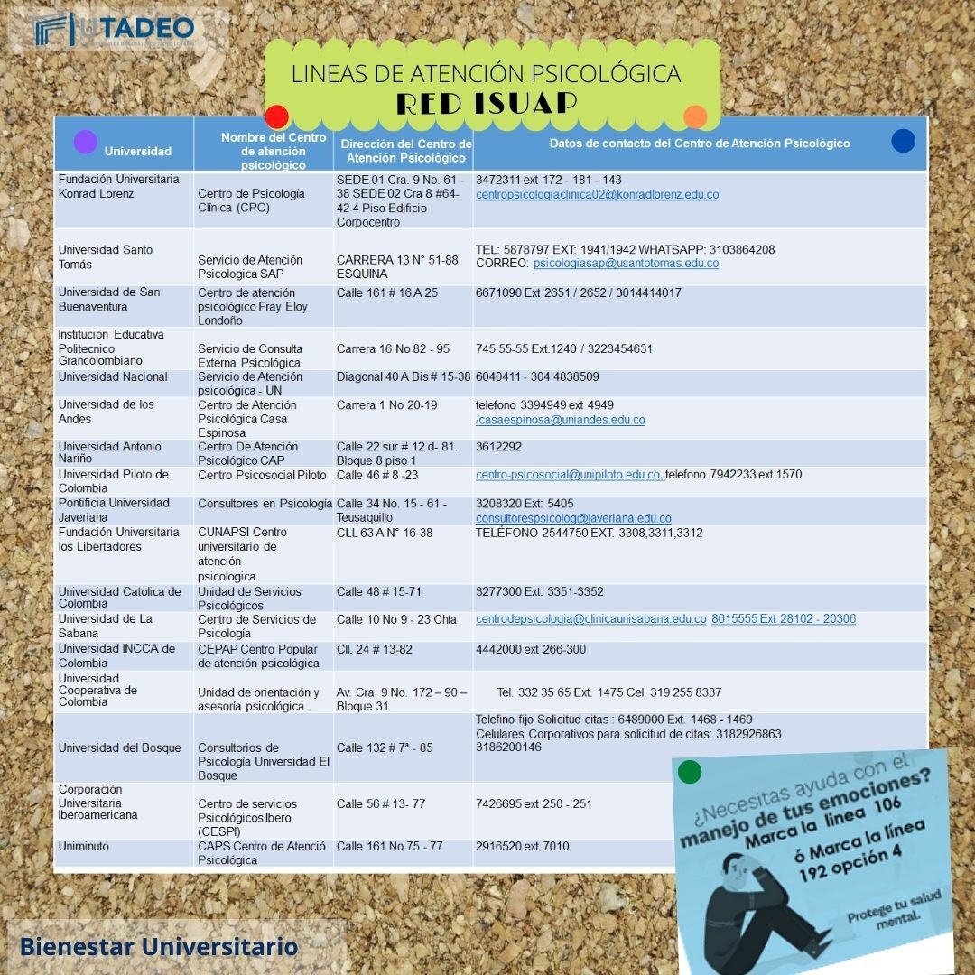 Apreciado estudiante: recuerda que desde Bienestar Universitario contamos con las líneas de atención de la RED ISUAP y las líneas a nivel nacional, donde también te pueden ayudar.