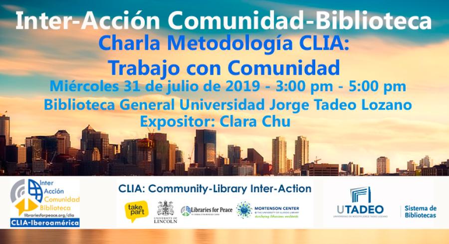 El Sistema de Bibliotecas de La Universidad de Bogotá Jorge Tadeo Lozano, invita a la "Charla sobre la metodología CLIA" a realizarse éste 31 de julio de 2019 en instalaciones de la Biblioteca General de UTadeo. Las bibliotecas, como anclas comunitarias, tienen la capacidad de enfrentar de forma compartida sus desafíos, mediante comprensión mutua, el empoderamiento, la reflexión y la acción colectiva. CLIA (Inter-Acción Comunidad-Biblioteca) es una práctica consciente, codiseñada entre diferentes actores internacionales, para que las bibliotecas sean facilitadoras de diálogo comunitario y la acción de, por y para la comunidad, encaminados a la transformación social. Cualquier biblioteca que establezca CLIA como práctica fortalece su rol como anclas de la comunidad, al enfocarse en trabajar CON y no solamente POR las comunidades. Las bibliotecas que ponen en práctica CLIA están contribuyendo con acción e impacto colectivos, para potenciar comunidades pacíficas y sostenibles alrededor del mundo.