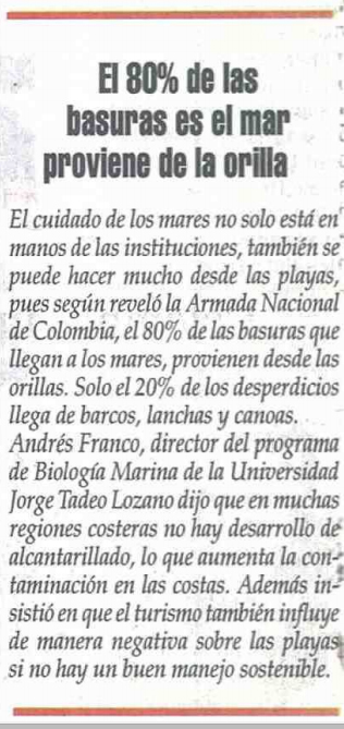 RCN La Radio y el diario La Libertad de Barranquilla, destacaron la opinión de Andrés Franco, director del programa de Biología Marina de Utadeo, sobre la contaminación de los mares colombianos. "Todos los desechos que pueden llegar desde las cuencas de los ríos y que a su vez llegan ahí por las actividades humanas de las poblaciones, pues van a afectar las playas y por consiguiente al mar" explica Franco.
