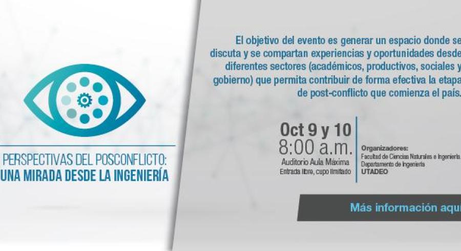 Pensando en lo anterior, el 9 y 10 de octubre, el Departamento de Ingeniería de Utadeo organizó un evento titulado “Perspectivas del posconflicto: una mirada desde la ingeniería”, que contará con la presencia de miembros del gobierno, de empresas y de diferentes universidades. Este evento servirá para compartir las experiencias que se tienen desde diversos sectores sobre el papel de la ingeniería en el posconflicto.