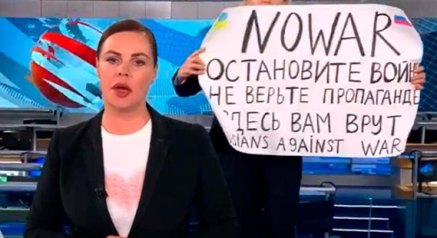 Una mujer protagonizó un tenso momento en un noticiero en Rusia tras incorporarse al plano principal con un cartel en contra de la invasión que lleva a cabo el país a Ucrania.