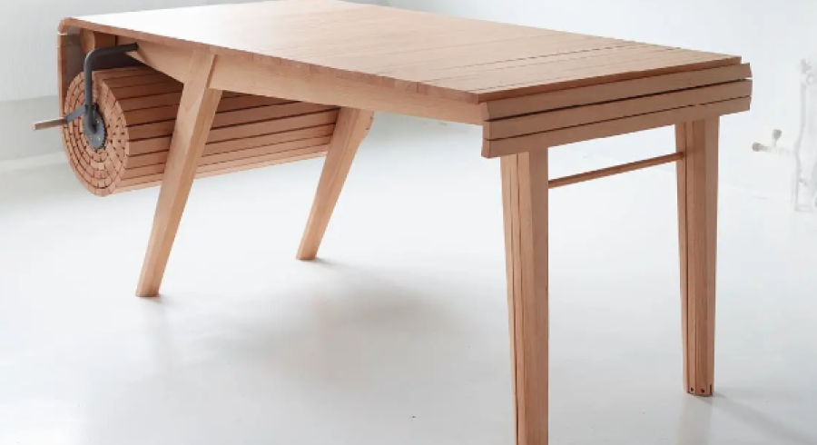 El concepto es utilizar la técnica telescópica en un extremo de la mesa consiguiendo que la misma pase de 1,5 metros a 4. Es un mecanismo al estilo «persiana» con su correspondiente manivela de acero que nos proporciona una mayor longitud al mismo tiempo que las patas alojadas al otro extremo del engranaje, van cambiando de posición.
