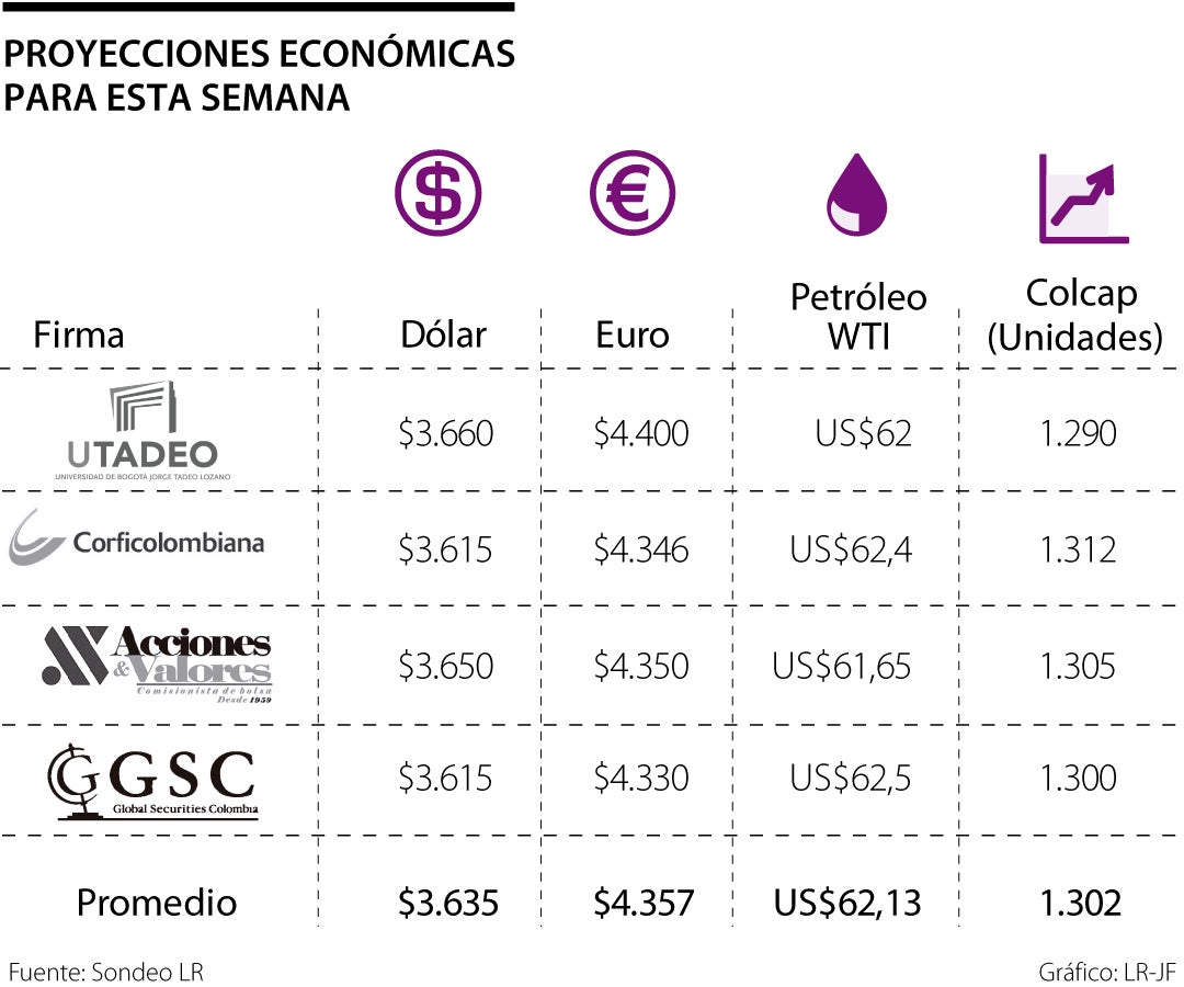 Según las proyecciones del Club de Finanzas de Utadeo, la moneda norteamericana alcanzaría un máximo de $3.660, el Euro sobre los $4.400, el petróleo a US$62 el barril; sin embargo, cabe resaltar que estas cifras puede fluctuar dependiendo de las diferentes decisiones que tomen los bancos centrales en Estados Unidos y Europa, a lo largo de la última semana de abril.