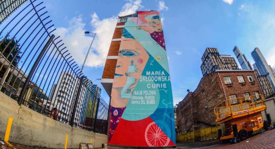 En inmediaciones a Utadeo, la Embajada de Polonia y la artista Lili Cuca han realizado un mural de 18 metros de altura que destaca a María Skłodowska Curie como “hija de Polonia, ciudadana francesa y científica del mundo”.