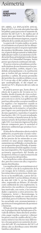 Señala que el conflicto con Rusia es uno de los principales elementos para esta situación "La guerra de Ucrania explica, en parte, el crecimiento en el precio de los alimentos, porque ese país es un gran exportador de cereales y fertilizantes. Antes de la guerra, el precio del gas natural —materia prima para la producción de fertilizantes— se había multiplicado por cuatro".