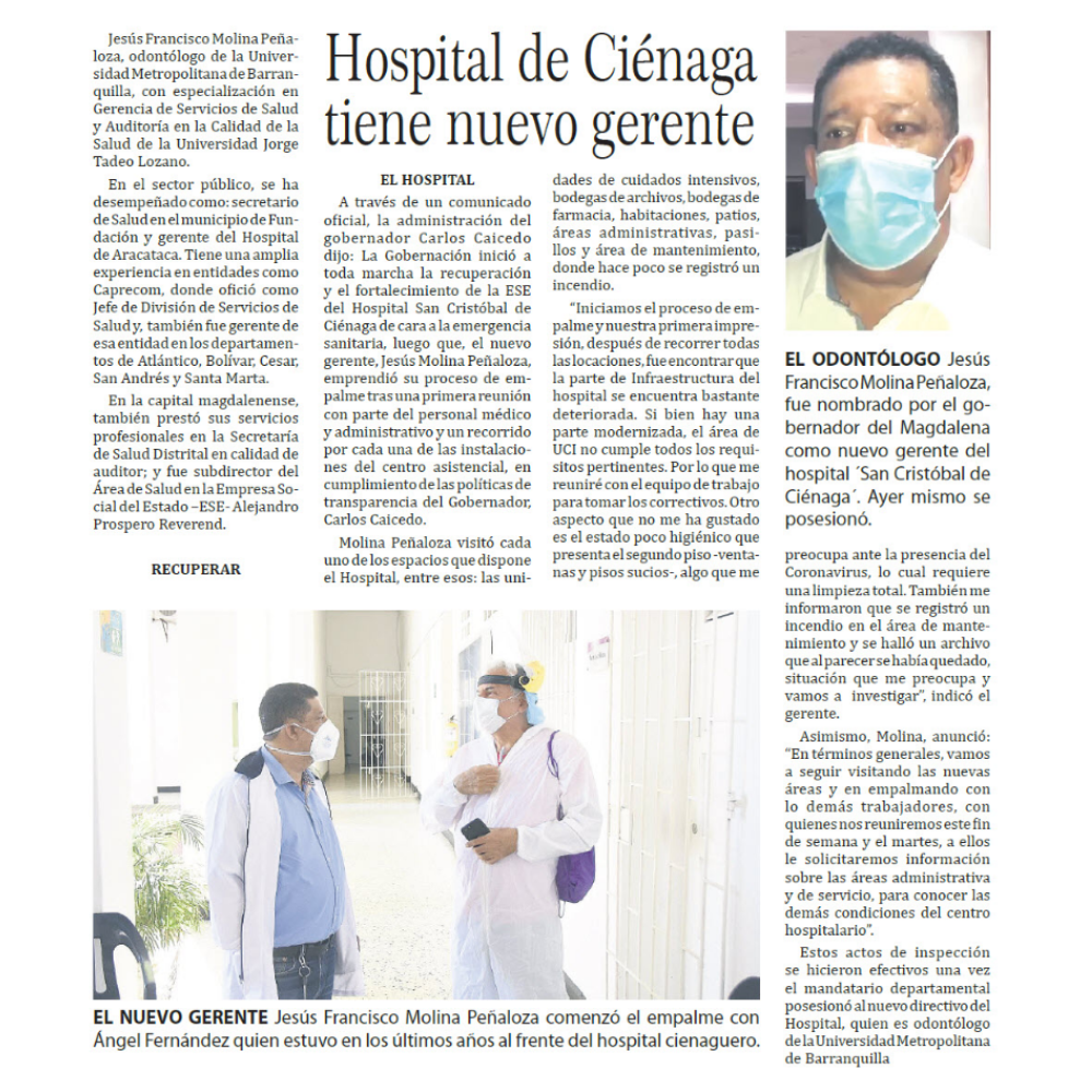 El gobernador de Magdalena, Carlos Caicedo, nombró al nuevo gerente del Hospital San Cristóbal del municipio de Ciénaga. Se trata de Jesús Francisco Molina Peñalosa, odontólogo de la Universidad Metropolitana de Barranquilla y especialista en Gerencia y Auditoría de la Calidad en Salud de Utadeo.