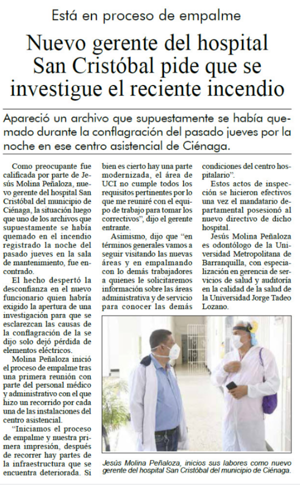 “La expectativa es bastante grande. Es un hospital que le está prestando los servicios a los municipios aledaños, Puebloviejo y Zona Bananera (…) tengo mucha expectativa. Lo conocí hace muchos años y la idea es darle para adelante”, señala Molina Peñalosa.