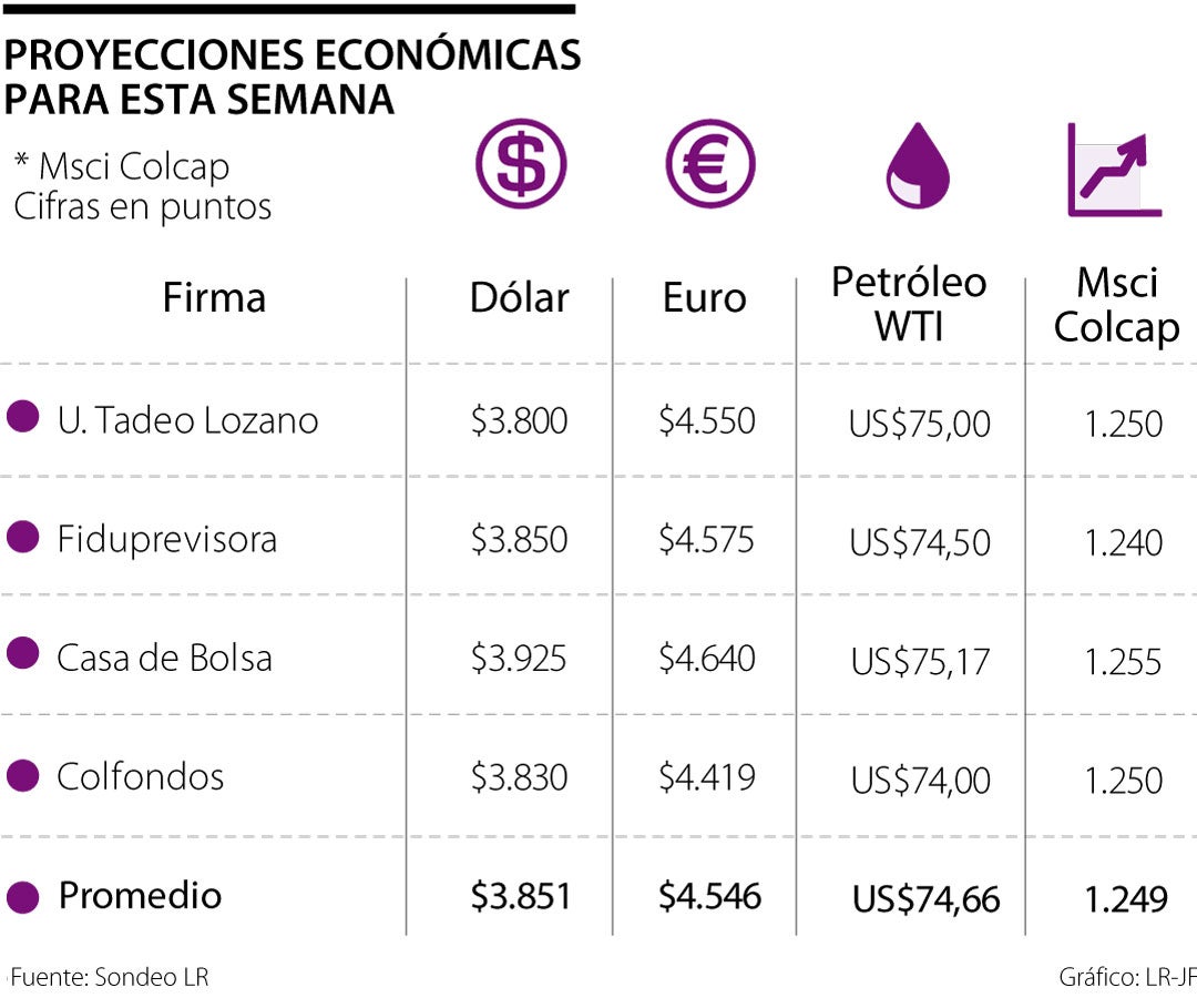 La República publicó las proyecciones del mercado accionario para esta semana del Club de Finanzas de Utadeo, quienes prevén que la moneda estadounidense alcance los $3.800, teniendo en cuenta que se conocerán los indicadores de actividad económica en Estados Unidos, en el último mes.
