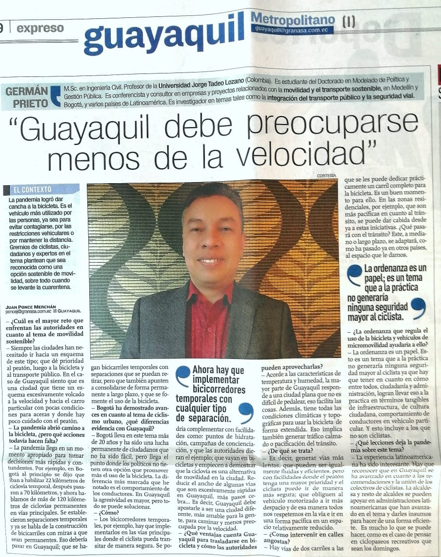 El profesor de la Especialización en Gerencia del Transporte de Utadeo, Germán Prieto, fue consultado por el diario Expreso, de Ecuador, en el que analizó los cambios que la pandemia ha originado en los sistemas de transporte de las principales ciudades del mundo, en especial en Guayaquil, donde la bicicleta viene tomando fuerza, pese a la falta bicicarriles.