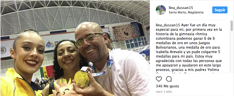 La tadeísta Lina Dussán brilló con luz propia en el campeonato de los XVII Juegos Bolivarianos Santa Marta 2017, en los que Colombia se impuso, al alcanzar, por primera vez en su historia, todas las medallas de oro posibles en la categoría de gimnasia rítmica. La estudiante de tercer semestre del programa de Comunicación Social – Periodismo de Utadeo obtuvo cinco preseas doradas en esta categoría, en las pruebas de mazas, balón, cinta, el concurso general individual y por equipos.