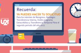 NovedadesJulio 05 / 2017Hasta el 16 de julio de 2017 usted puede realizar sus trámites de Reingreso, Reintegro, Doble Programa, Extracréditos, Transferencia Interna y Transferencia Temporal, para el segundo período académico de 2017.