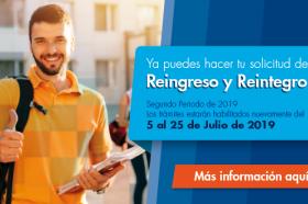NovedadesJunio 21 / 2019Del 5 al 25 de julio de 2019 puedes realizar nuevamente tus trámites de Reingreso o Reintegro, revisa las condiciones y el trámite que debes hacer. Te esperamos.