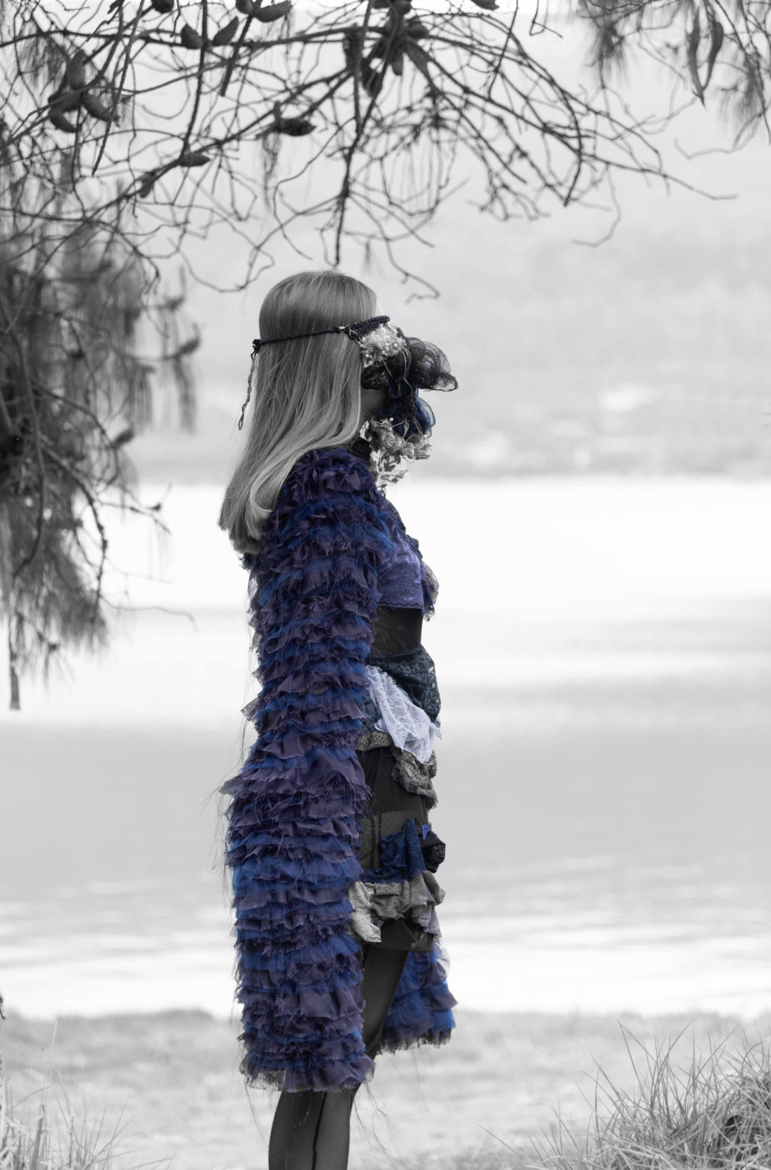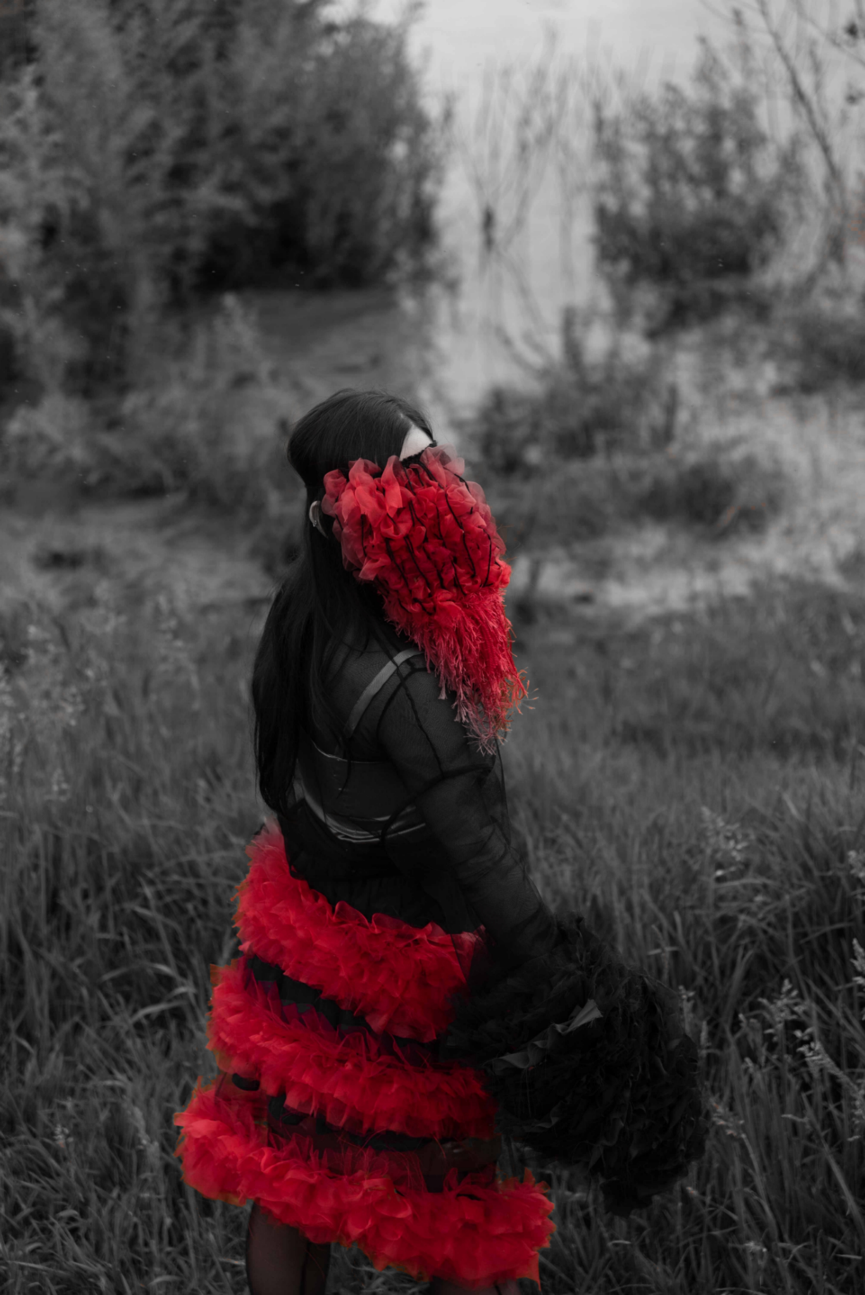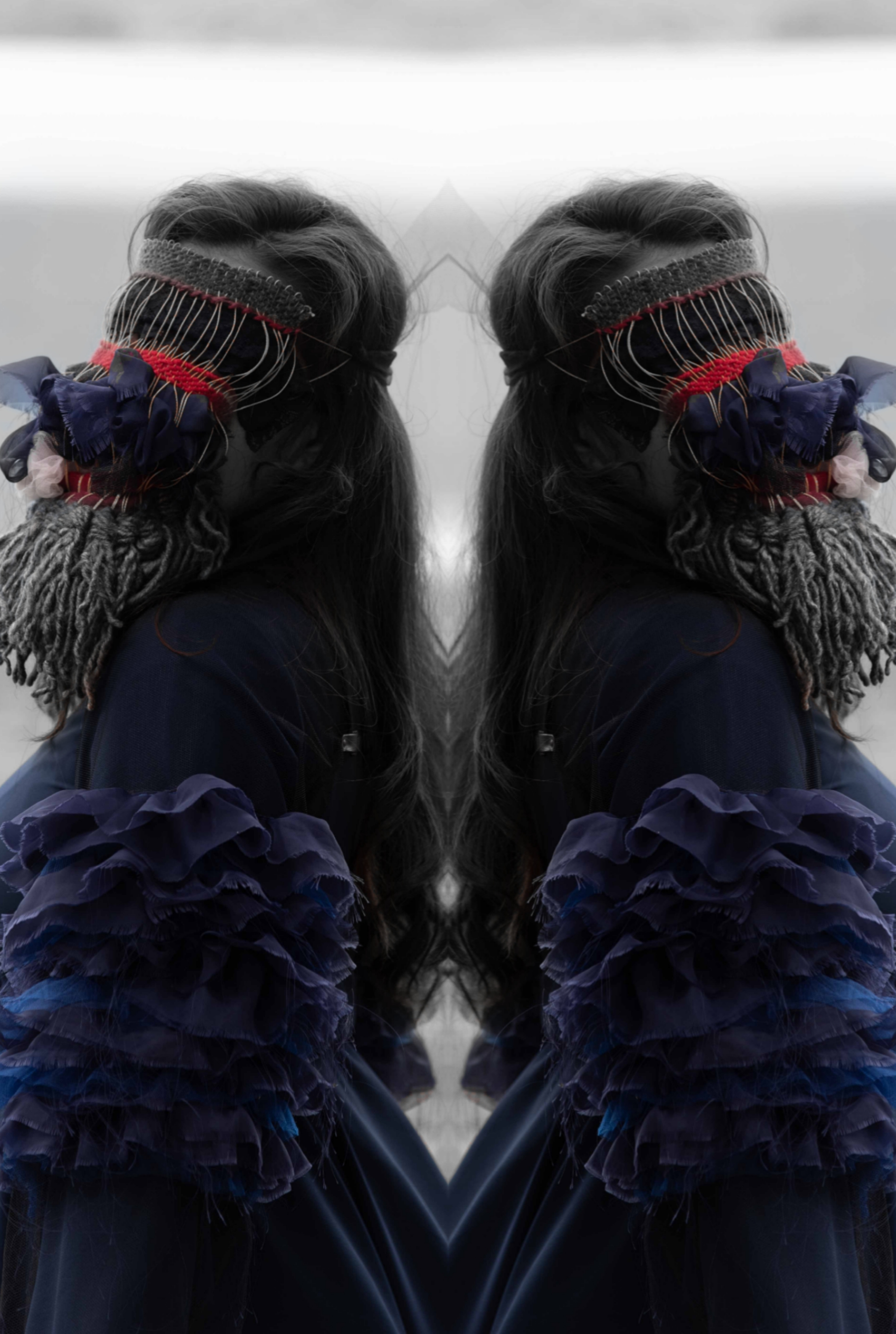 Sobre todo utilizamos poliéster, que fue lo que más encontramos, tul, chalis reciclado de camisas, chiffon, más que nada velos por la transparencia, buscando con estos reflejar lo que unx es por dentro, lo que cada unx carga.