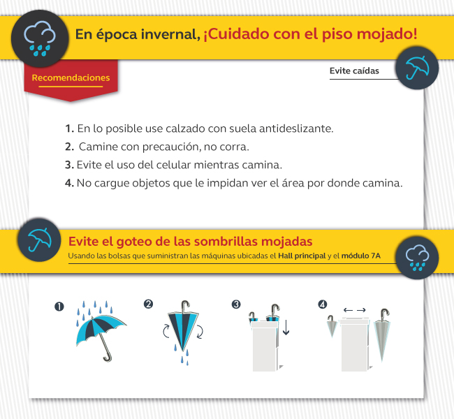 La Universidad Jorge Tadeo Lozano y el COPASST, le recomienda estos tips para evitar accidentes en esta temporada de lluvias que se inició en Bogotá y le invita a utilizar las máquinas ubicadas en el Hall Principal y en el módulo 7A para guardar las sombrillas en las bolsas que éstas suministran.