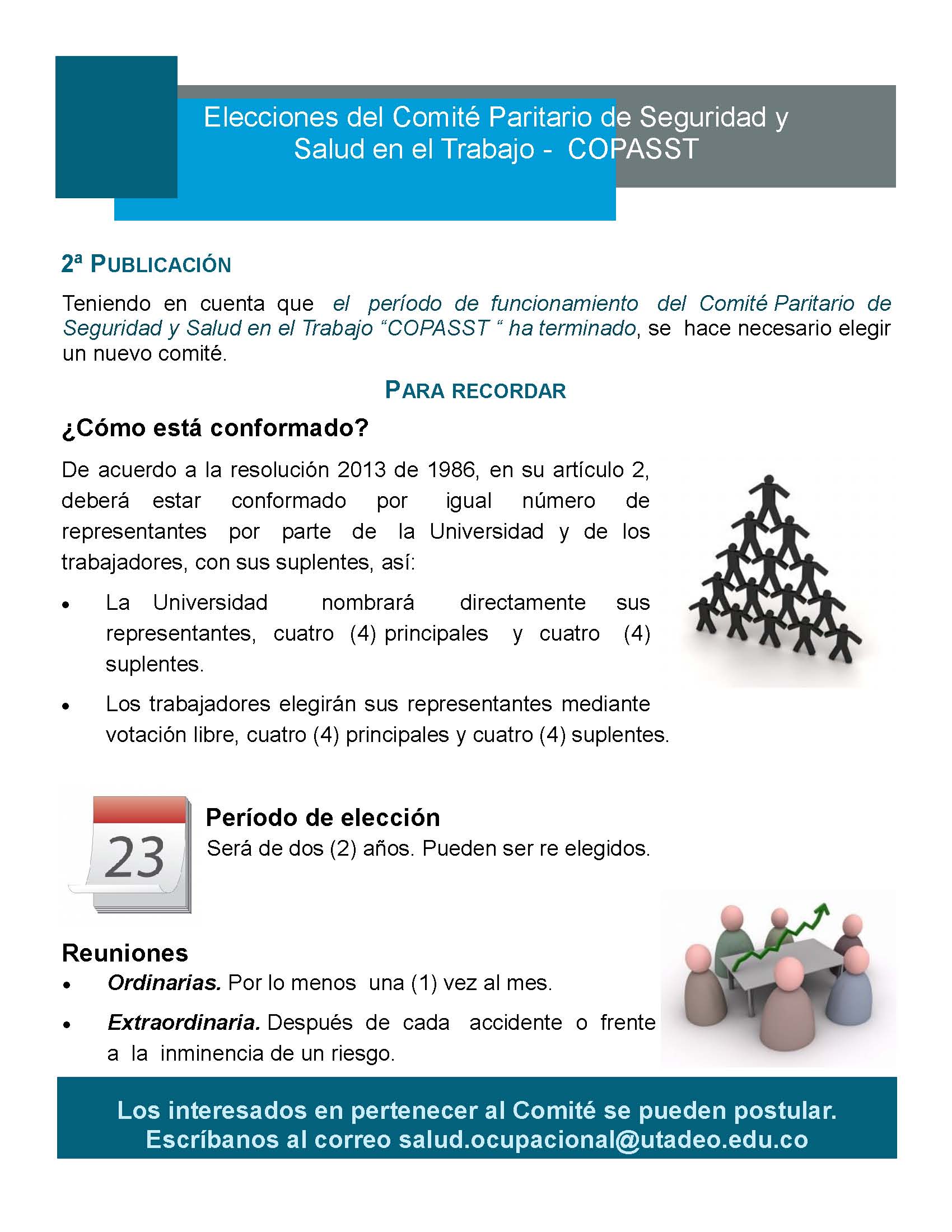 Estan abiertas las inscripciones para que postule su candidato al COPASST. El periodo de elección será por dos años y sus miembros pueden ser reelegidos.