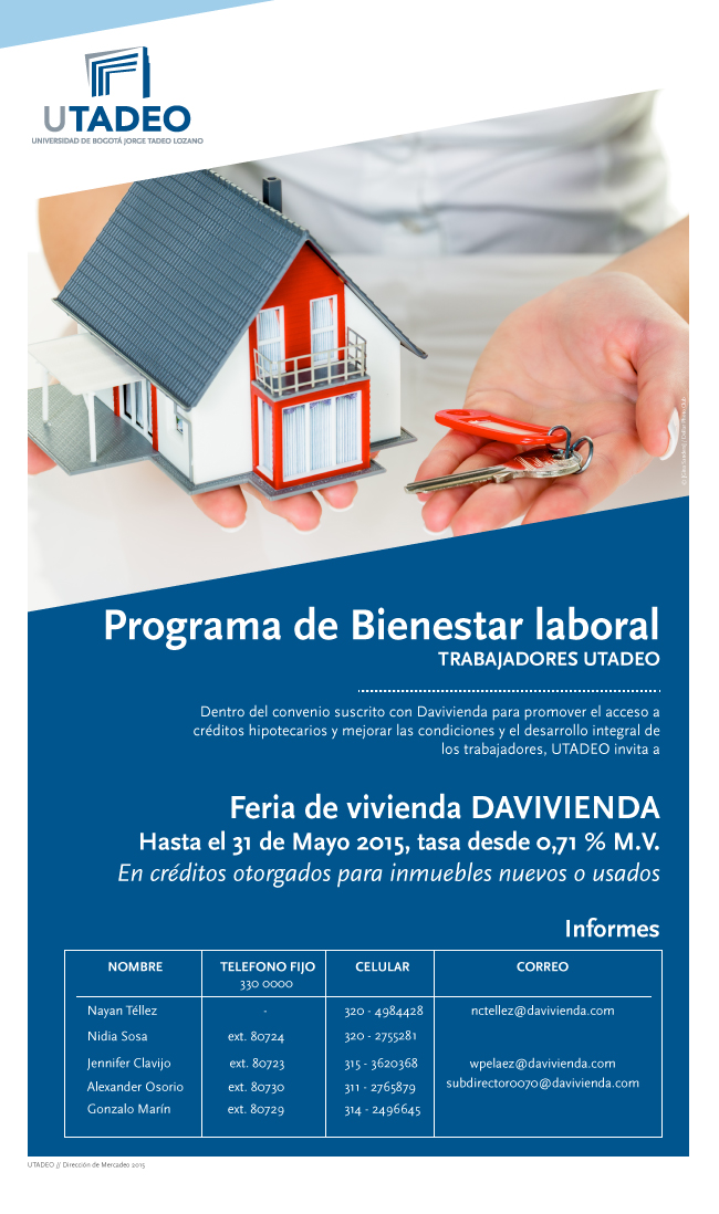 Feria de Vivivienda - Davivienda Compartir en Conozca las nuevas tasas de interés preferenciales en los créditos para vivienda que ofrece el Banco Davivienda para los trabajadores de la Universidad. vivienda_davivienda_utadeo_mayo.jpg