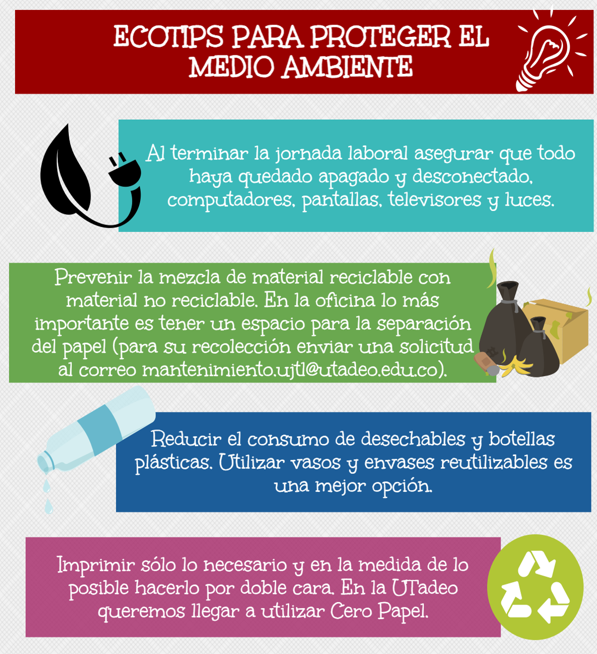 En la UTadeo estamos comprometidos con la protección del Medio Ambiente. Participa realizando estas pequeñas acciones durante tus actividades diarias.