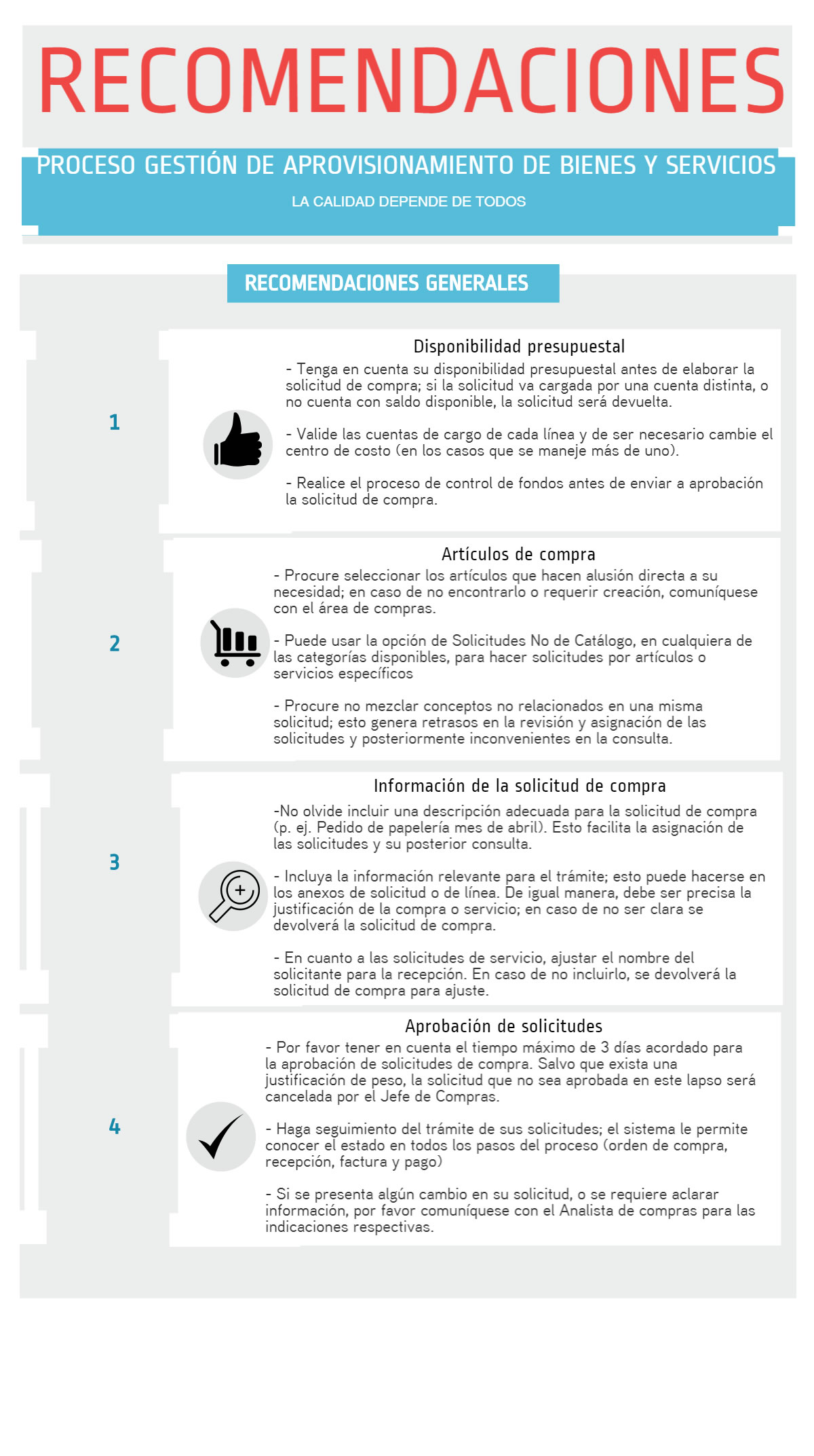 Tenga en cuenta las recomendaciones para la ejecución del proceso de Gestión de Aprovisionamiento de Bienes y Servicios