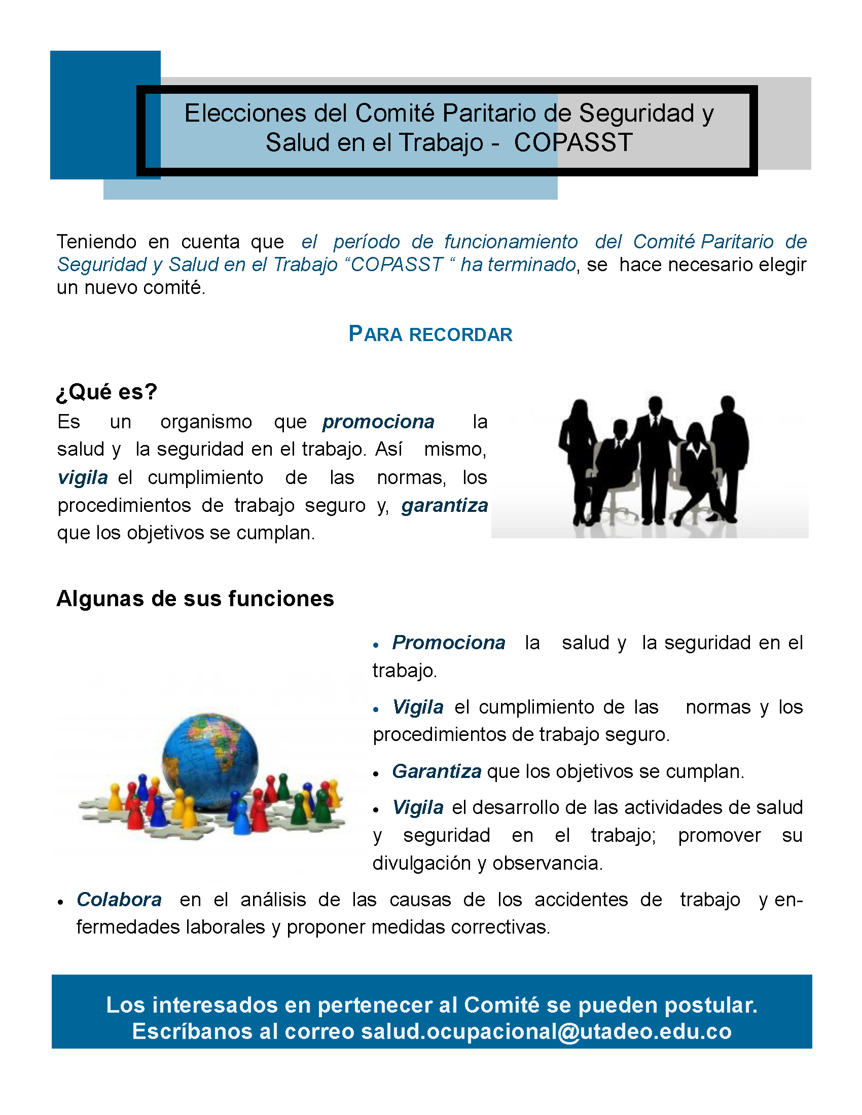 El período de funcionamiento del Comité Paritario de Seguridad y Salud en el Trabajo ha terminado, los interesados se pueden postular enviando un correo a salud.ocupacional@utadeo.edu.co.