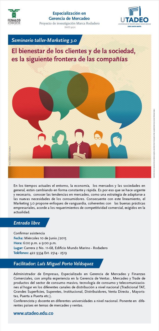 SeminariosSeminario taller Marketing 3.0Fecha del evento: Miércoles, Junio 10, 2015 - 18:00Fecha fin del evento: Miércoles, Junio 10, 2015 - 21:00 Compartir en Entrada libre seminario_taller_marketing_3.0_fenalco-utadeo_especializacion_en_gerencia_de_mercadeo_santa_marta-junio_10_2015.jpg PDF Pieza digital Seminario Taller Marketing 3.0