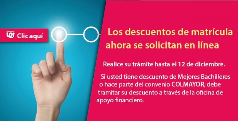 La Universidad en convenio con diferentes entidades, otorga descuentos en sus programas académicos a la comunidad estudiantil. Los descuentos NO son acumulables ni retroactivos. A continuación encontrarás los diferentes tipos de descuento que te ofrece la Universidad.